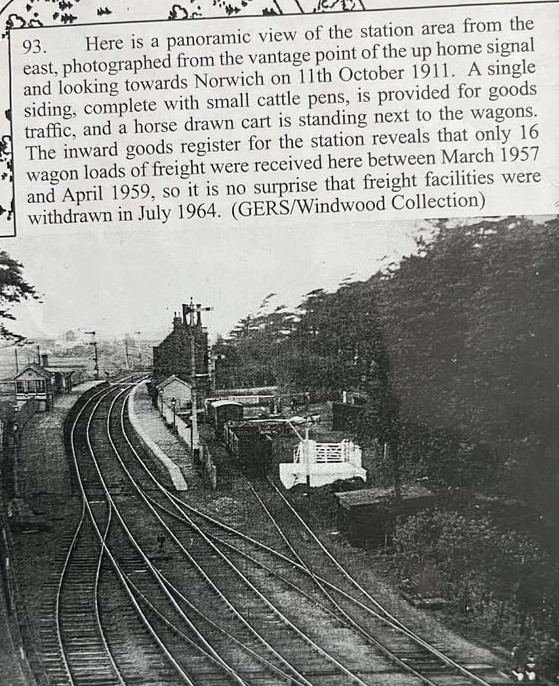 There was a siding at the station can be seen in the photograph below. As described this has a cattle pen, but was never used extensively, and as a result was removed in 1964. Credit for this photo goes to GERS/Windwood collection.